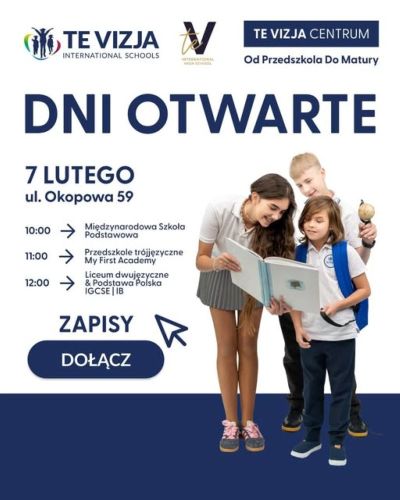 Już w sobotę, 7 lutego, zapraszamy do Warszawy, na ulicę Okopową 59, na dni otwarte Towarzystwa Edukacyjnego VIZJA. To spotkanie dla wszystkich, którzy chcą zobaczyć, jak może wyglądać nowoczesna edukacja oparta na dwujęzyczności – od przedszkola aż po liceum. W TE VIZJA stawiamy nie tylko na wysoki poziom nauczania, ale również na rozwój emocjonalny uczniów, kreatywność i bezpieczne, inspirujące środowisko do nauki. Podczas dni otwartych liceum będzie można poznać oferowane programy edukacyjne, takie jak Cambridge IGCSE, A-Levels, IBDP oraz matura polska. To także okazja, by spotkać naszych nauczycieli, porozmawiać z uczniami, zobaczyć sale lekcyjne i pracownie oraz wziąć udział w warsztatach i spotkaniach. Dni otwarte pozwalają naprawdę poczuć atmosferę szkoły i sprawdzić, czy to miejsce odpowiada Waszym potrzebom i planom na przyszłość. Zapraszamy do TE VIZJA — do zobaczenia! – zaprasza Marzena Godlewska,